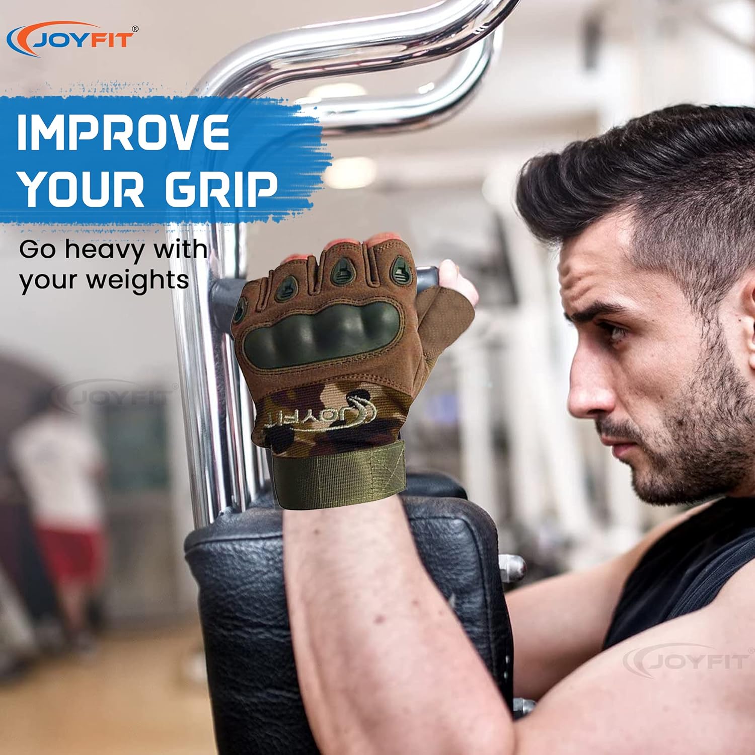 [EFFICIENT PROTECTION]: The Joyfit workout gloves make sure that your hands stay protected during the workout. The foam padding creates a cushioning layer before your palms and prevents injuries like callus tears, blisters and corns while working out. The wrist support helps shift the weight of the equipment from the wrist joint. The adjustable strap keeps the gloves in place for the entire duration of the exercise. The rubber padding over knuckles ensure safety and stability to your fingers.