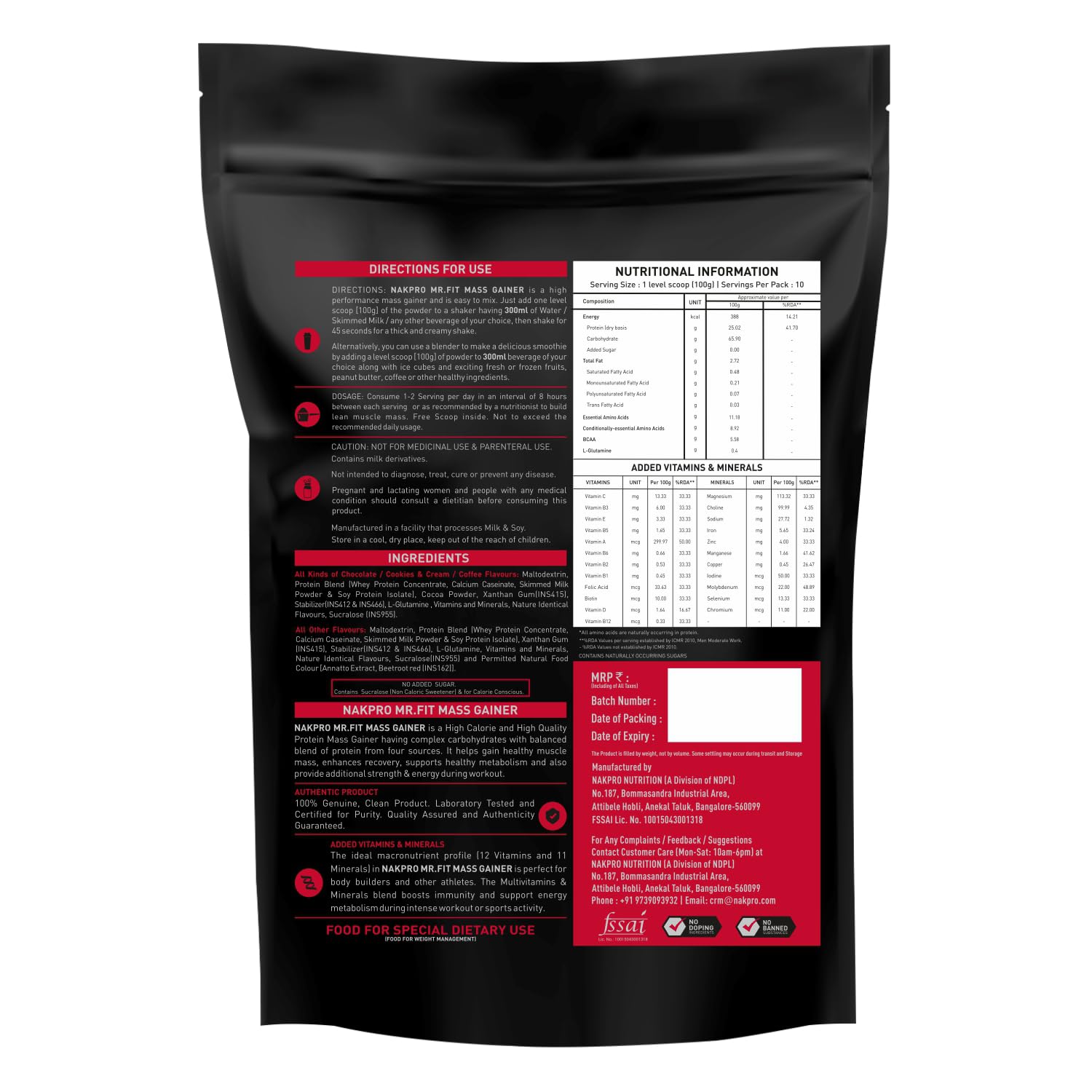 PACKED WITH 23 VITAMINS & MINERALS: NAKPRO MR FIT Mass Gainer is enriched with 23 vitamins and minerals that help in boosting immunity and provide performance fuel to conquer your workout. It contains no added sugar and is trans-fat-free.