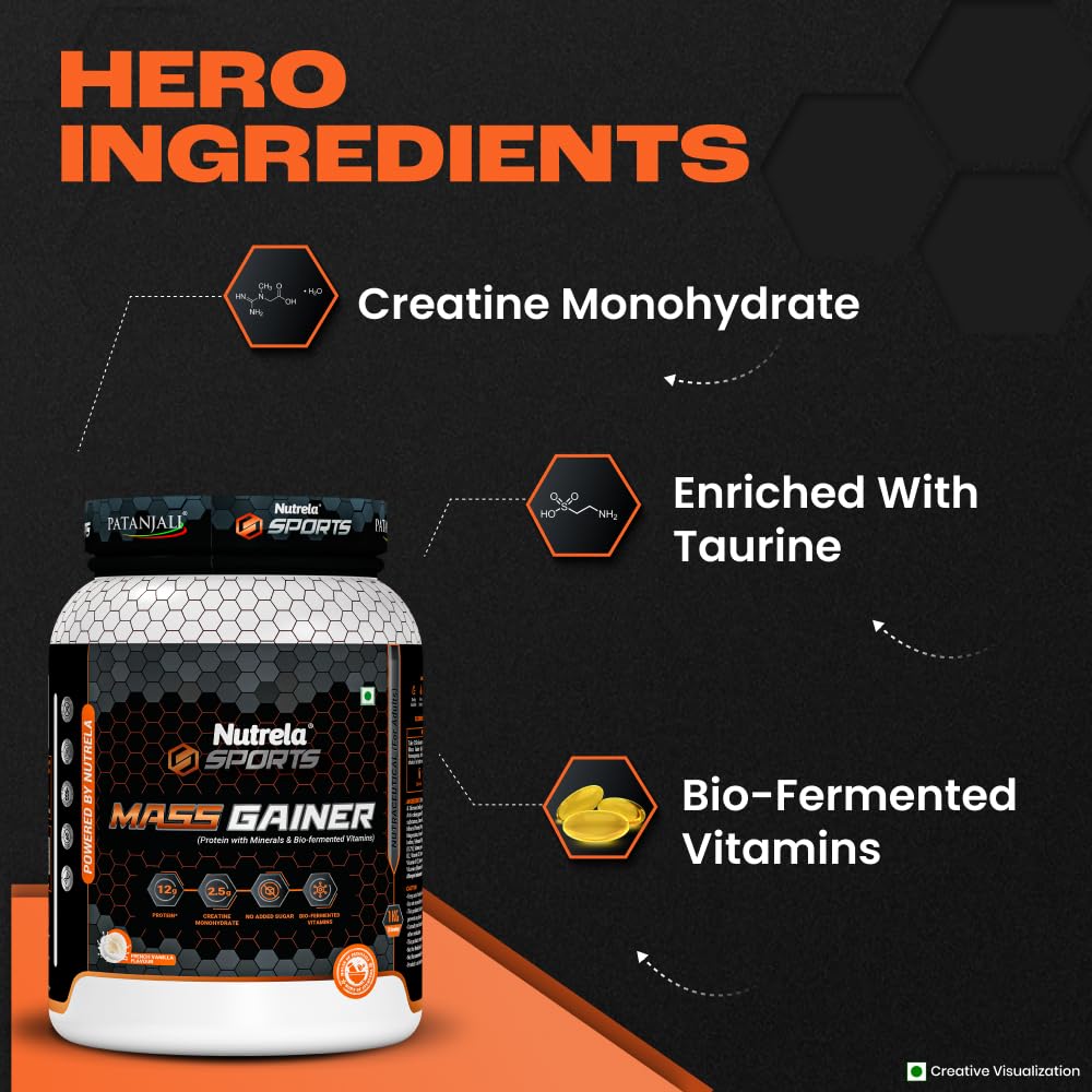 1.NUTRELA SPORTS – MASS GAINER Nutrela Sports MassGainer is formulated with bio-fermented vitamins, creatine monohydrate, Taurine, and other essential amino acids and minerals for you to be your better self every day