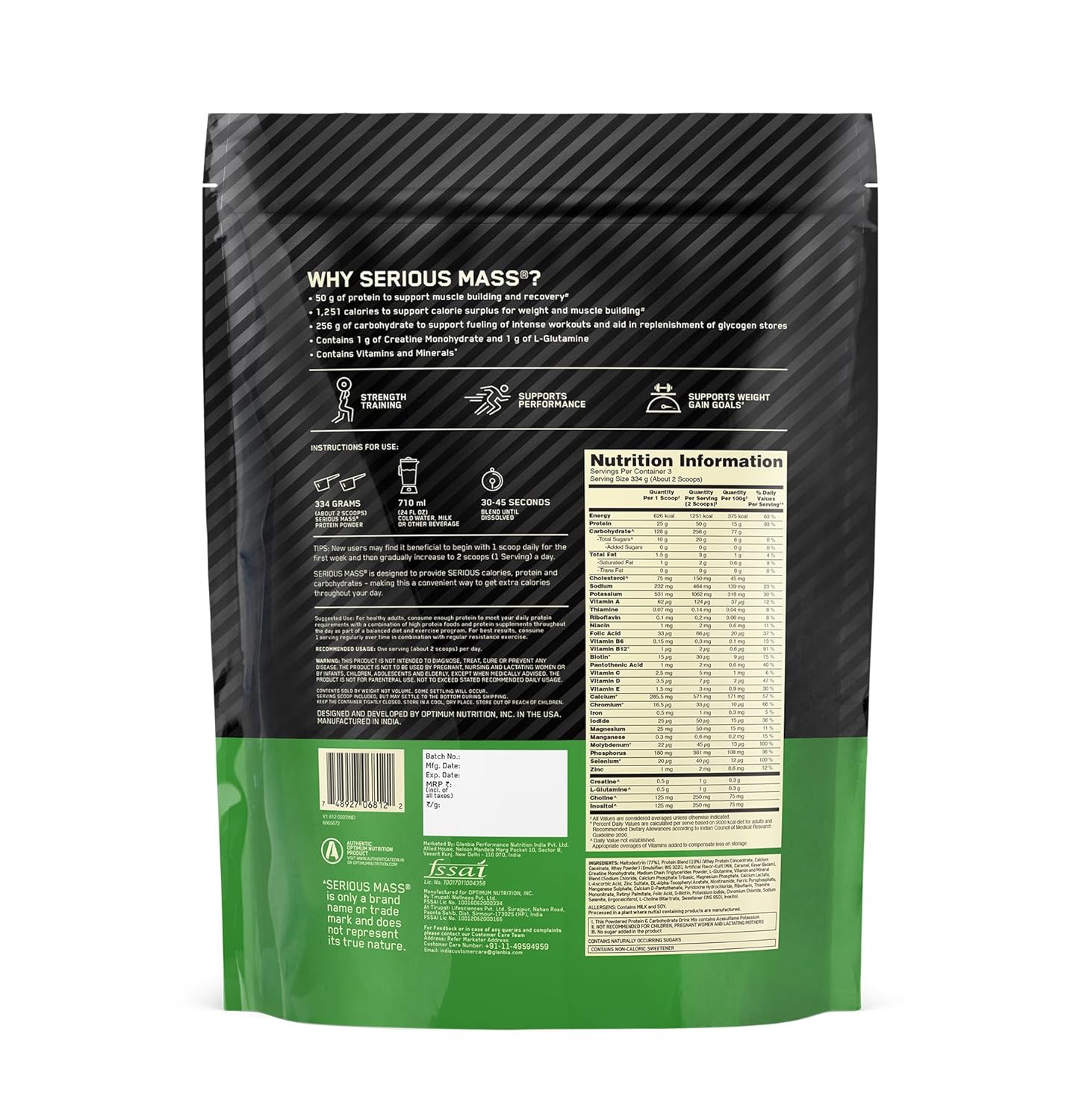 What is Serious Mass: Vegetarian Optimum Nutrition Serious Mass is a high calorie weight gainer which is also high in protein and when taken over time with regular resistance exercise and a balanced diet can help you gain mass and muscle.