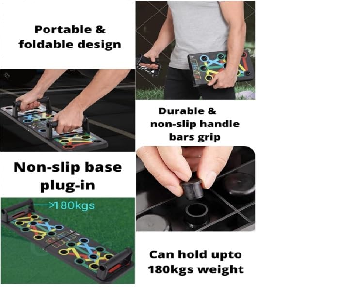 15-in-1 Push-Up Board – Ultimate Home Workout Solution Take your home workouts to the next level with the 15-in-1 Push-Up Board, a versatile fitness tool designed to help you build strength and sculpt your upper body. This innovative push-up board features a unique color-coded system that targets specific muscle groups, including the chest, back, shoulders, and triceps. Key Features: ✅ 15-in-1 Multi-Function Design – Easily adjust your hand positions using the color-coded slots to activate different muscles and maximize results. ✅ Muscle Targeting System – Blue – Chest Red – Shoulders Yellow – Triceps Green – Back ✅ Durable & Sturdy Construction – Made from high-quality, non-slip ABS plastic, ensuring stability and safety during workouts. ✅ Portable & Lightweight – The compact, foldable design allows you to take it anywhere, making it perfect for home, office, or travel workouts. ✅ Non-Slip Handles – Ergonomic grip handles provide comfort and reduce strain on the wrists. ✅ Easy to Use – Just plug and press your handles into the designated slots to instantly switch up your workout routine. Benefits: ✔ Builds upper body strength and endurance ✔ Engages multiple muscle groups for a full-body workout ✔ Improves posture and core stability ✔ Suitable for beginners and advanced fitness enthusiasts Whether you are a beginner or a seasoned fitness lover, the 15-in-1 Push-Up Board is your go-to home workout companion, helping you achieve your fitness goals with ease and efficiency.