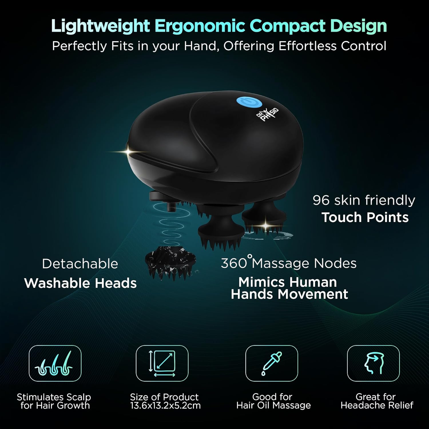 RELAXING HEAD MASSAGE: Imagine yourself unwinding after a hectic day with the ultimate head massage! The compact Dr Physio Head and Scalp Massager delivers a deep, soothing scalp massage that boosts blood circulation and relieves tension for total relaxation. Featuring 360° rotating heads with soft claws, it mimics the gentle yet effective touch of human fingertips for rejuvenating experience. Beyond relaxation, it promotes healthier hair growth, enhances scalp health, leaving your scalp clean, refreshed, and revitalized.