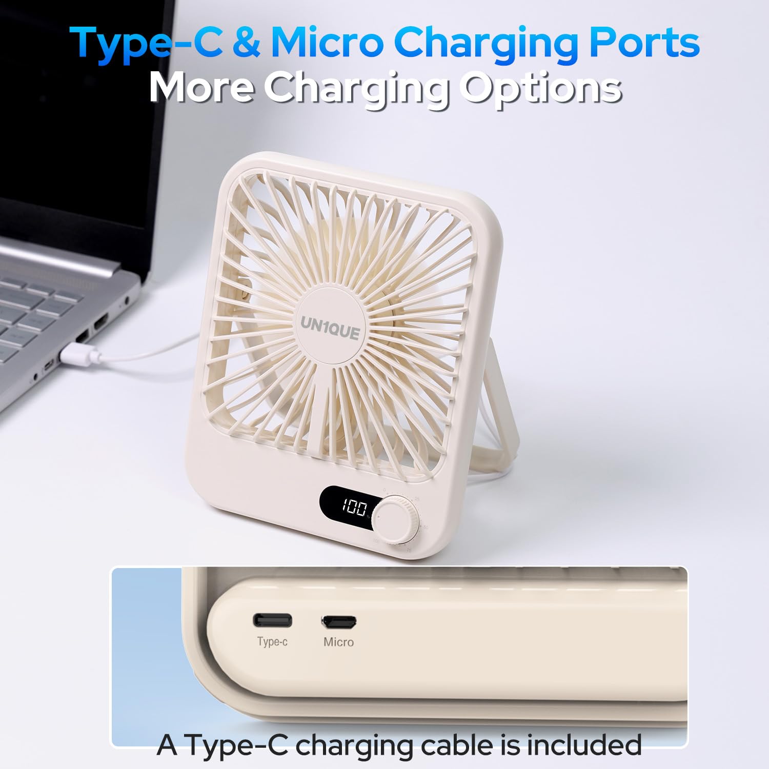 【Portability Perfected】: With its ultra-thin design and versatile stand, UN1QUE mini fan is ready for any adventure. Whether it’s perched on your desk or hanging by your side, take it with you wherever you go – from libraries to offices to outdoor escapades.