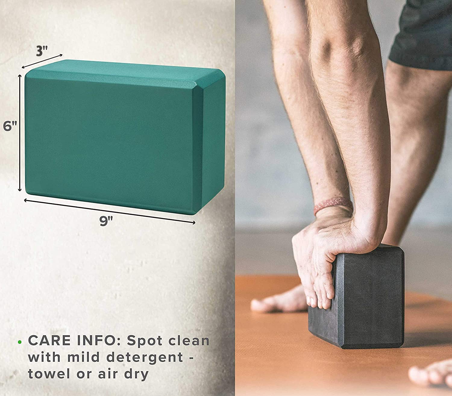 2 Pack Yoga Blocks, 9″ x 6″ x 3″ The solid foam blocks have rounded edges and enough give to support comfortably in any posture. The yoga blocks can be used on any side to flex the height your need.